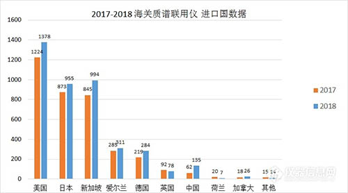 根據(jù)海關(guān)數(shù)據(jù),近年來,我國主要從美國、日本、新加坡、愛爾蘭、德國、英國、荷蘭、加拿大等國家進口質(zhì)譜聯(lián)用儀。同時由于從保稅區(qū)等方式進口,也有一部分從中國進口的質(zhì)譜聯(lián)用儀。從圖中可以看到,2018年,除英國和荷蘭外,中國從各主要國家進口的質(zhì)譜聯(lián)用儀數(shù)目均有不同程度的增長。