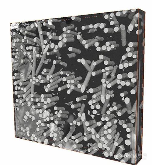 圖2.使用Helios Hydra CX DualBeam采用O+聚焦離子束和AS&V4軟件進行自動連續切片的汽車機油濾清器殼體(聚合物/玻璃纖維復合材料)的三維重構。HFW(水平寬度)為350μm。