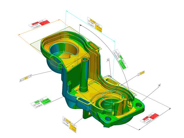 工業光學3D掃描儀通過高度精確的3D點云形式,生成實際加工零件的精確圖像。掃描數據不僅可以對特定點進行三維評價,還可以直接與數字目標模型(例如:CAD數據集)進行比較。通過色階可以一目了然地看到偏差,并且可以輕松地定位到錯誤點。
