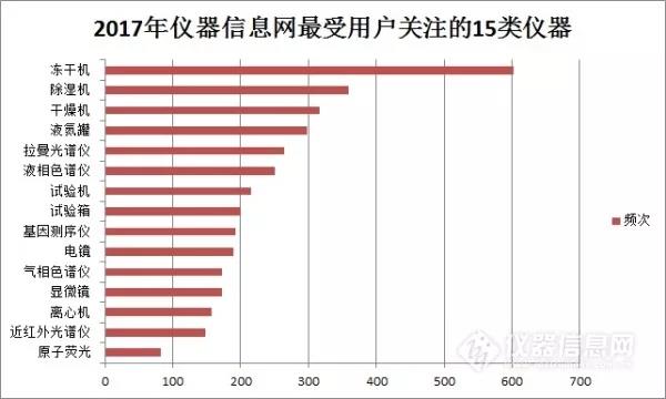 2017年,儀器信息網資訊欄目最受用戶關注的是凍干機、除濕機、干燥機、液氮罐、拉曼光譜儀等15個儀器類別,其中5類屬于實驗室常用設備,光譜儀3類,色譜儀、物性測試儀器、光學儀器各兩類。2017全年含“色譜”二字的關鍵詞共出現1007次,“光譜”出現877次,“質譜”出現646次。